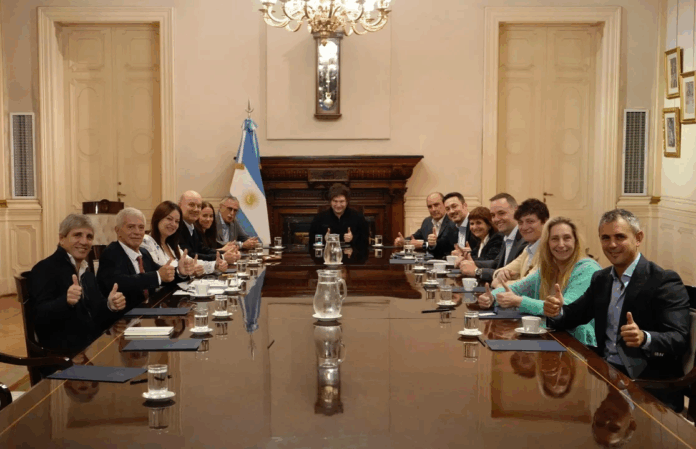 El titular de la Cámara de Diputados, Martín Menem, y el asesor presidencial, Santiago Caputo, también están presentes en la reunión.